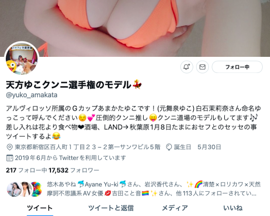 不太对劲啊,我们都知道日本经纪人协会强烈要求旗下成员不得让女优去拍无码影片,所以会出现在FC2或DTI集团(就加勒比、一本道、Heyzo等片商)出鲍的几乎都是无经纪公司所属的女优。但这次的天方ゆこ(天方由子)不同,她不但才去了SOD酒场的活动,twitter也一直有更新,虽然没有提到自己拍无码的事,但她酒照喝舞照跳歌照唱,看起来正常的不得了〜