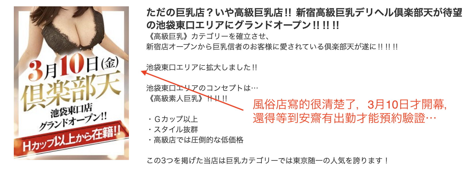 这是一间名为「天」的外送店,主打的是有名艺能人及AV女优在籍,而打出安斋らら(安斋拉拉)在店的是他们即将在池袋东口盛大开幕的新店,所以现在你问我是真是假的我也答不出来ー我没有忘了去问经纪人,对方的答案和我想的一样就是「确认します(我去确认一下)」然后就不再联络,以一般经纪人对女优在卖的事总是爱装神秘的态度来看,应该是等不到答案惹〜